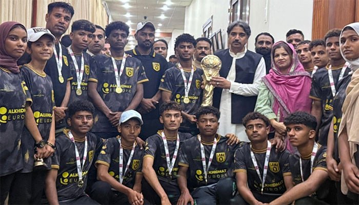 پارلیمانی سیکریٹری و ایم پی اے شازیہ کریم سنگھار کے ہمراہ سندھ اسمبلی پہنچنے والی ٹیم نے عالمی فٹبال ایونٹ ناروے کپ 2025ء اپنے نام کر کے دنیا بھر میں سبز ہلالی پرچم لہرایا۔