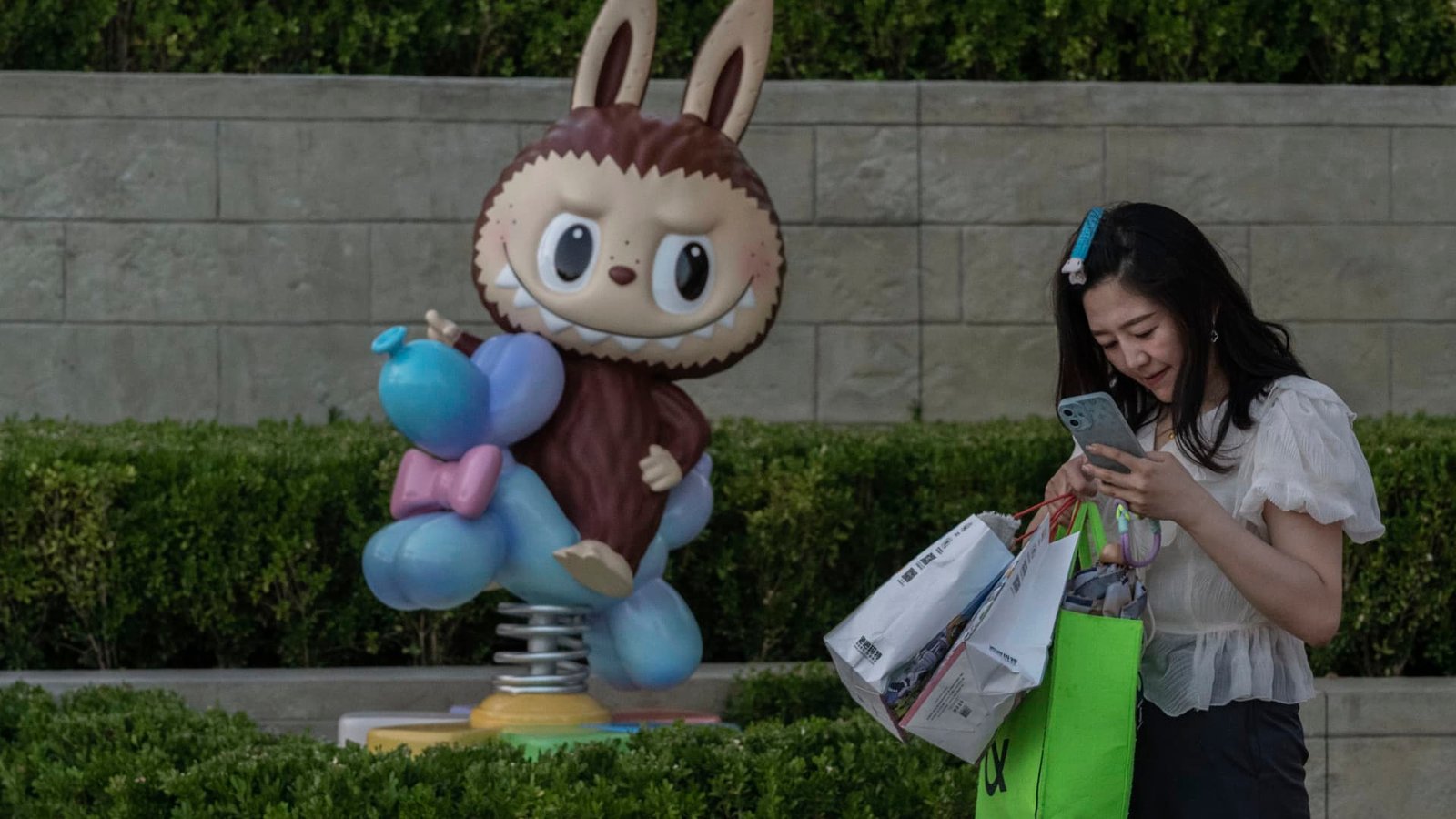 A woman looks at there phone as she carries shopping bags next to a character from Pop Mart’s hugely popular Labubu dolls series while visiting the Pop Land theme park on July 17, 2025 in Beijing, China.