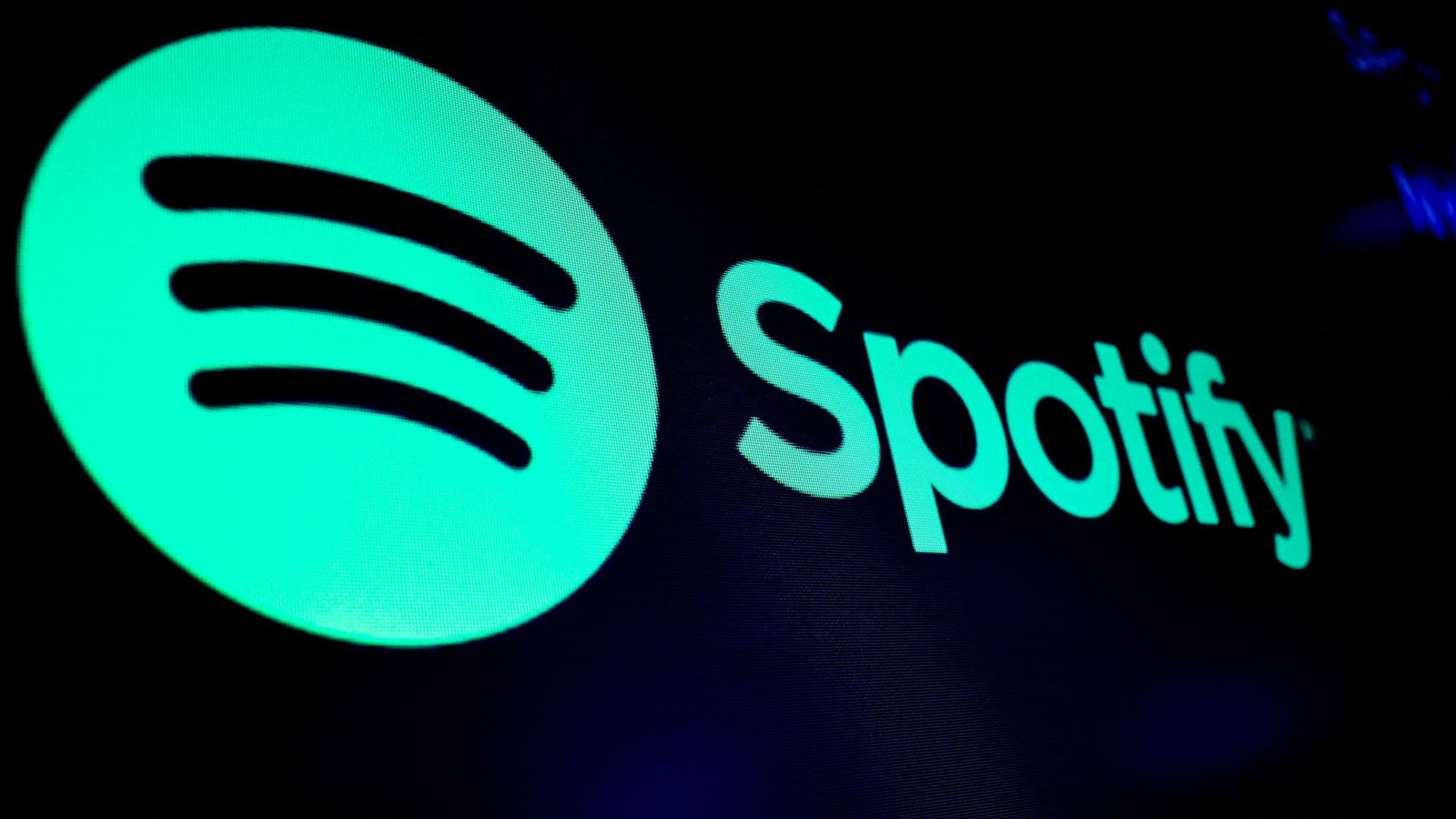A screen displays the logo of Spotify on the floor at the New York Stock Exchange on Dec. 4, 2023.
