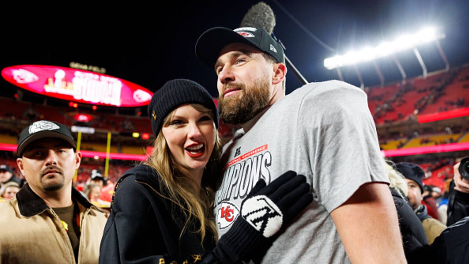 Tight end Travis Kelce, #87 of the Kansas City Chiefs, celebrates with Taylor Swift after the AFC championship football game against the Buffalo Bills, at GEHA Field at Arrowhead Stadium in Kansas City, Missouri, on Jan. 26, 2025.