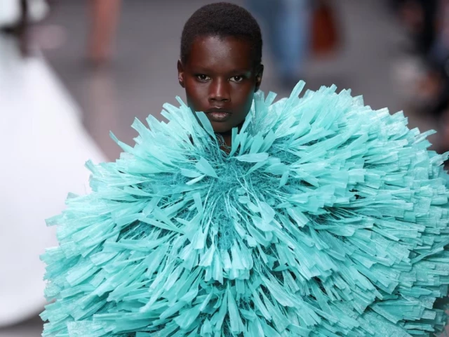 Models moved quickly down the runway, parading short dresses made from piles of raffia and pastel gowns in an airy plant-based feather alternative. There were also double-breasted suits with sharp shoulders, short skirts with extra flounce and slouchy jeans.